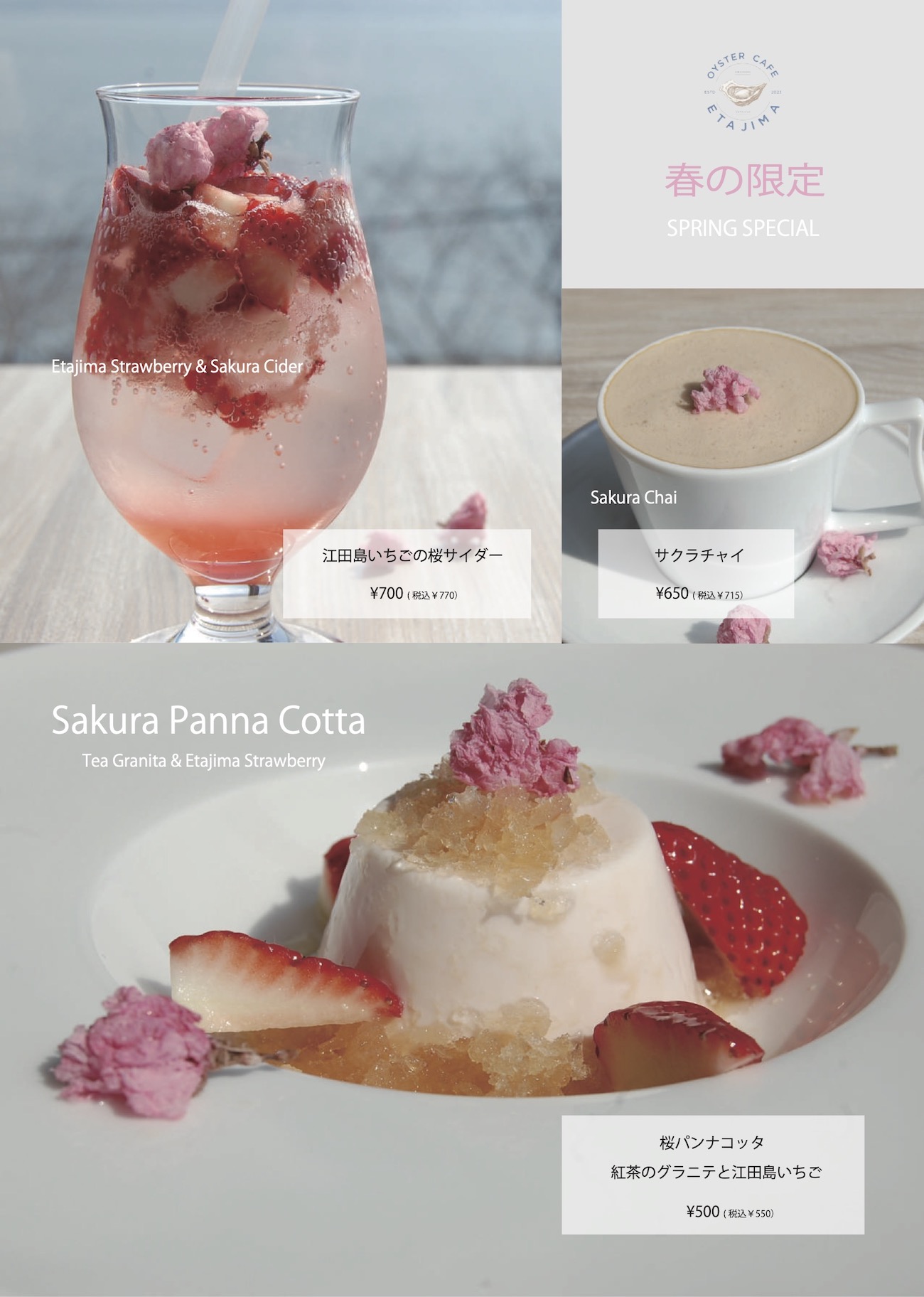 【店内から眺める桜と、春限定「江田島いちご×桜」メニューのご案内】